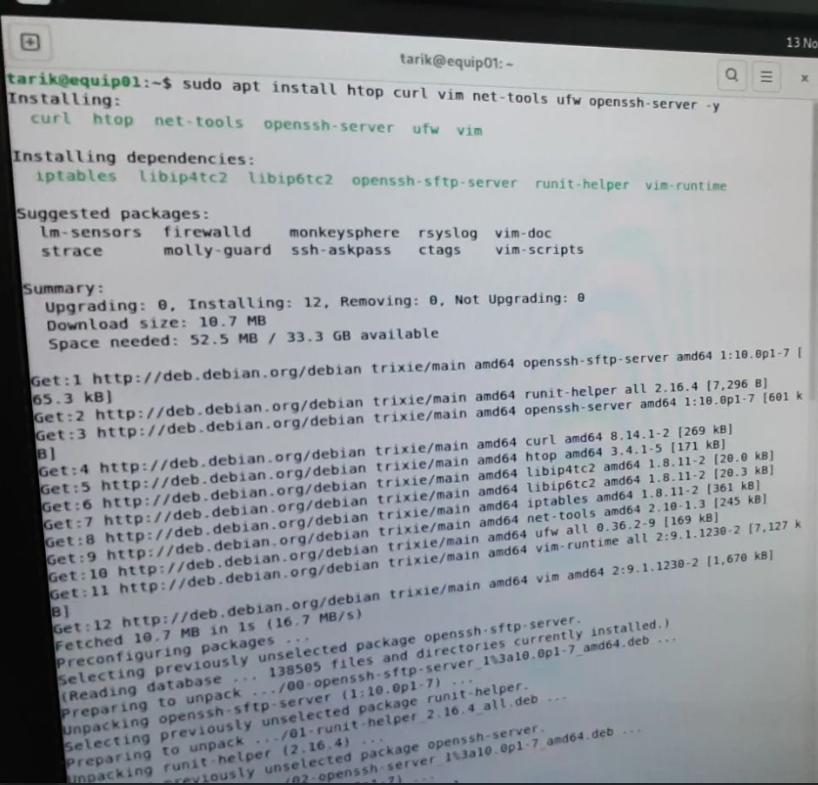 Com a primer pas, he instal·lat el servei OpenSSH Server (openssh-server) juntament amb altres eines d’administració essencials. Aquesta instal·lació és crucial per poder configurar posteriorment l’accés remot segur per terminal, tal com es detalla al Pas 1 de la documentació. La comanda utilitzada per a la instal·lació ha estat: sudo apt install ... openssh-server -y.