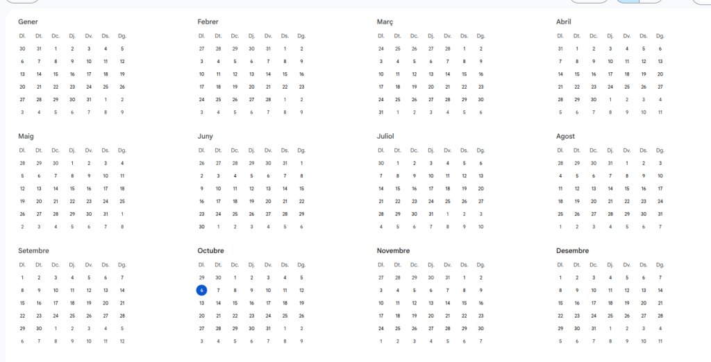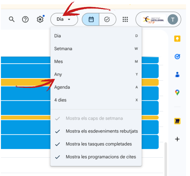 I després, quan he acabat de configurar l’horari acadèmic, he anat a la part superior dreta, on hi ha el dia i una fletxa cap avall. Clico la fletxa, s’obre un menú i selecciono “any”