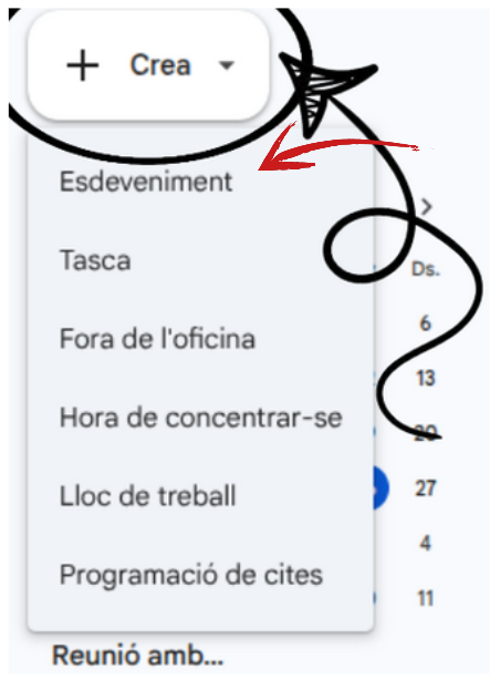 Quan clicaves a “Crea”, apareixia un menú desplegable i seleccionaves “Esdeveniment”.