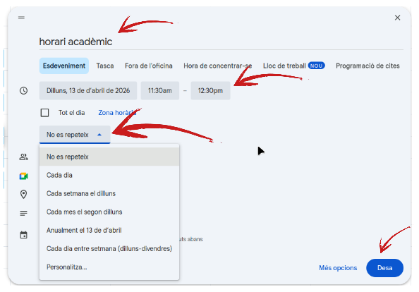 Quan accedeixes a l’opció “Esdeveniment”, s’obre aquesta finestra des d’on pots configurar el nom i l’horari de l’activitat. A més, disposes d’un menú que et permet establir la repetició automàtica de l’esdeveniment. En aquest cas, s’ha seleccionat l’opció “Cada setmana de dilluns a divendres” per mantenir el teu horari acadèmic actiu durant tot l’any.
