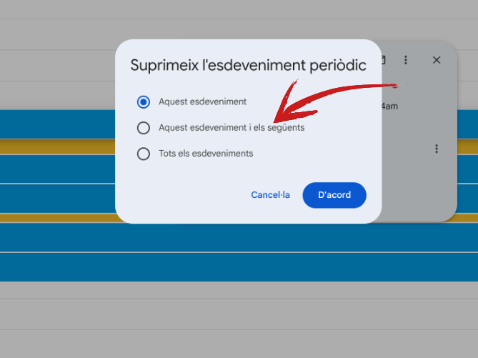 Hice clic en “Borrar este evento y los siguientes”, para eliminar todos los eventos del calendario que ya no correspondían al año siguiente.