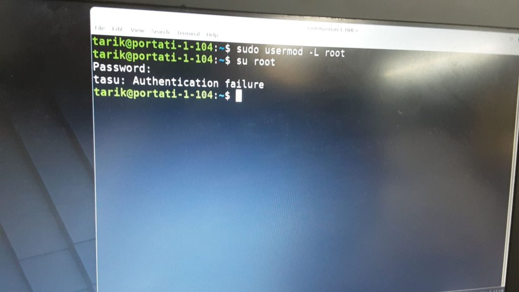 En executar la comanda su root després de fer sudo usermod -L root, el sistema mostra el missatge «Authentication failure», indicant que el compte root no es pot utilitzar per iniciar sessió.