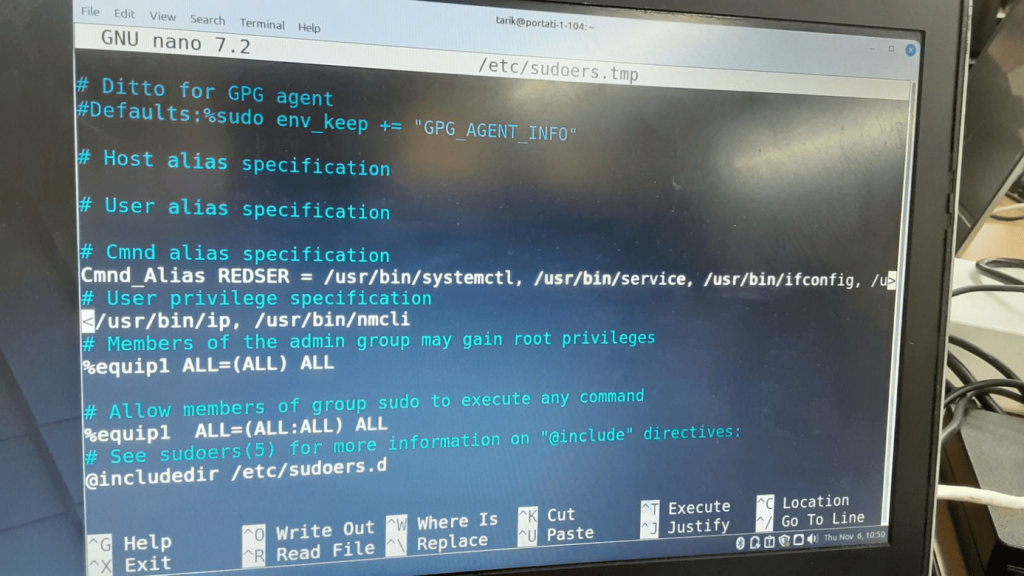 A continuació, s’ha definit al fitxer /etc/sudoers la configuració dels privilegis. Hem afegit l’usuari major amb permisos limitats per gestionar serveis i la xarxa mitjançant l’àlies REDSER, i hem assignat privilegis totals al grup equip1, format pels usuaris nominals del nostre equip. Aquesta configuració garanteix un control segur dels permisos dins del sistema.