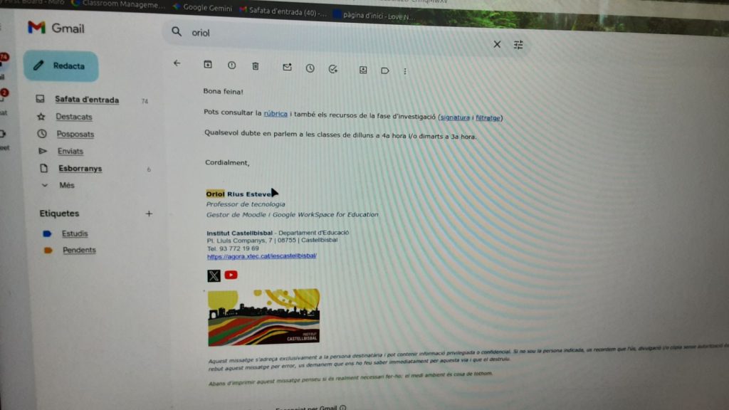 Tal com mostra la captura, aquesta imatge s’ha localitzat i extret de la signatura d’un correu electrònic rebut per part del professorat (en aquest cas, d’Oriol Rius Esteve). Aquesta imatge es desarà per, posteriorment, transferir-la a l’equip client mitjançant una memòria USB i establir-la com a fons d’escriptori.