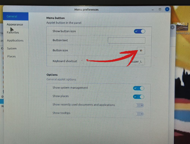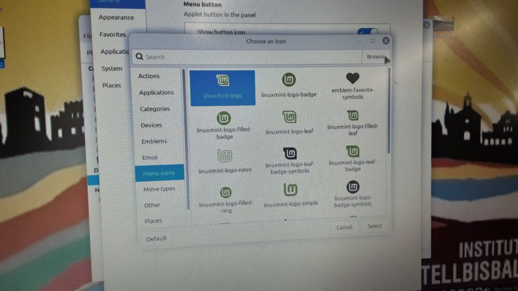 Per replicar l’estètica dels ordinadors del centre, és fonamental canviar la icona per defecte del botó d’inici (el menú de l’aplicació). Per aconseguir-ho, es fa clic sobre el selector de la “Button icon”