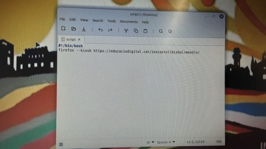 Creem l'script **script.sh**. Aquest s'encarregarà d'iniciar el navegador (Firefox) en mode **--kiosk**, que és una pantalla completa sense elements d'interfície que puguin distreure o permetre la navegació a altres llocs.