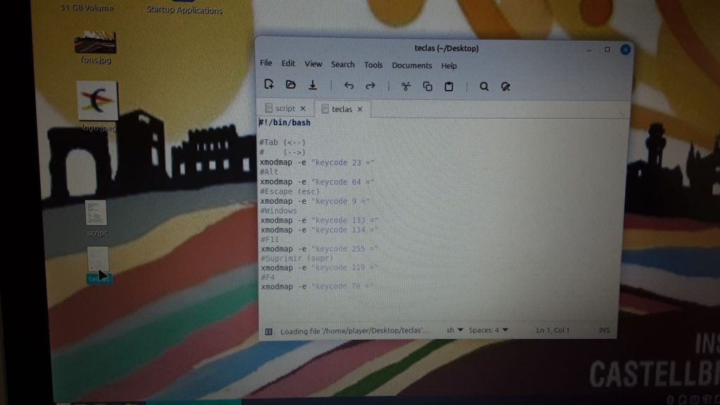 A la captura es mostra l’edició d’un segon script (anomenat teclas), que utilitza la utilitat xmodmap per remapejar o deshabilitar les funcions de tecles crítiques: