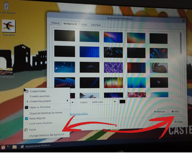 Dins d’aquest diàleg, cal prémer el botó “Add…” (Afegir) per navegar fins a la ubicació on s’ha desat la imatge (unnamed.jpg) i incorporar-la a la col·lecció de fons de pantalla disponibles. Posteriorment, la imatge serà seleccionada per replicar fidelment l’entorn visual del centre.