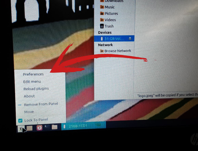 En aquesta captura es mostra l’accés a les opcions de configuració del panell. Per dur-ho a terme, s’ha fet clic dret sobre el menú d’aplicacions o sobre una àrea buida del panell, i s’ha seleccionat l’opció “Preferences” (Preferències).