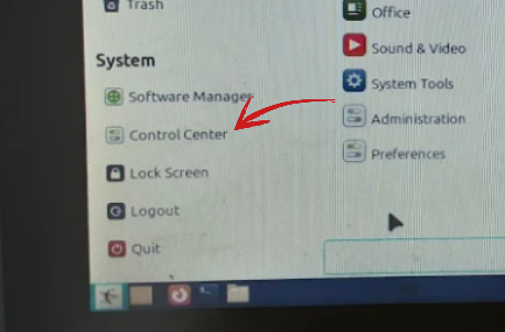 Per tal d’iniciar la configuració de la xarxa, primer vaig accedir al menú principal del sistema operatiu client (sembla ser Linux Mint o similar). Dins d’aquest menú, vaig navegar fins a l’opció “Control Center” (Centre de Control) per trobar les eines d’administració del sistema.
