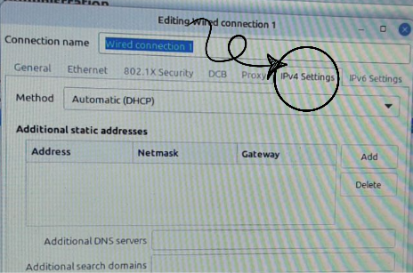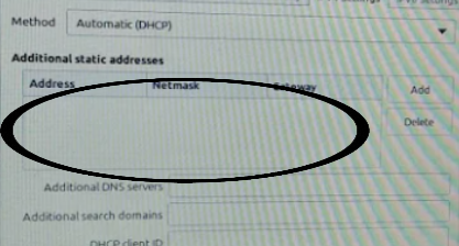 Aquesta imatge és un detall de la pestanya “IPv4 Settings”. Els camps visibles, com “Address” (Adreça IP), “Netmask” (Màscara de subxarxa) i “Gateway” (Passarel·la), s’utilitzen normalment per a la configuració manual (estàtica) de la xarxa.