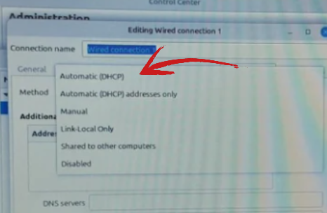 Després d’accedir a la pestanya “IPv4 Settings” (Configuració IPv4) de la connexió “Wired connection 1”, vaig fer clic al desplegable del camp “Method” (Mètode). En aquest pas, vaig seleccionar l’opció “Automatic (DHCP)” per indicar al sistema operatiu client que ha de sol·licitar la seva configuració de xarxa (IP, màscara, porta d’enllaç, DNS) al servidor DHCP.