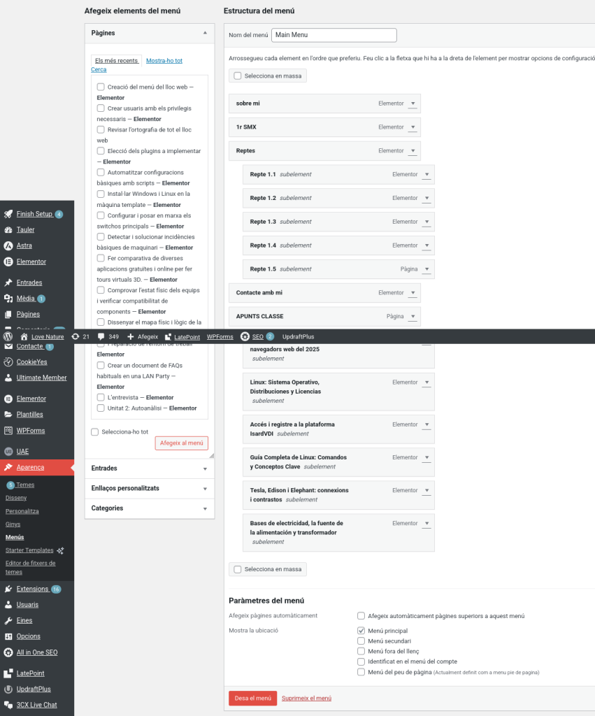 He triat una estructura neta per no marejar l’usuari. He prioritzat els apartats de iPOP! i Apunts al principi perquè és el que més es farà servir. Per evitar que el menú sigui una llista infinita i lletja, he agrupat els Reptes dins d’un desplegable anomenat 1r SMX. Així la web es veu ordenada i l’usuari només veu els reptes quan realment els busca. Les polítiques les he enviat al final perquè són obligatòries però no han de destorbar la navegació principal.