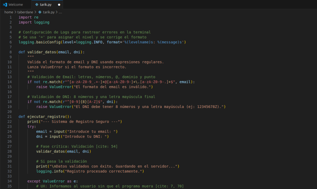 He implementat un sistema de registre que utilitza expressions regulars per a la validació i logging per al rastreig d'esdeveniments.