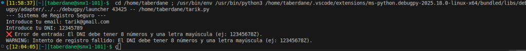 Captura de terminal mostrant la gestió d'un DNI mal format: