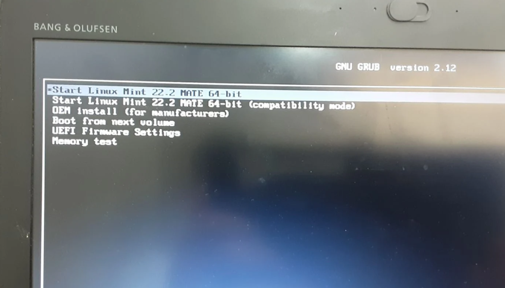 Aquest és el pas més important! Aquí hem de seleccionar la primera opció: Start Linux Mint 22.2 MATE 64-bit.