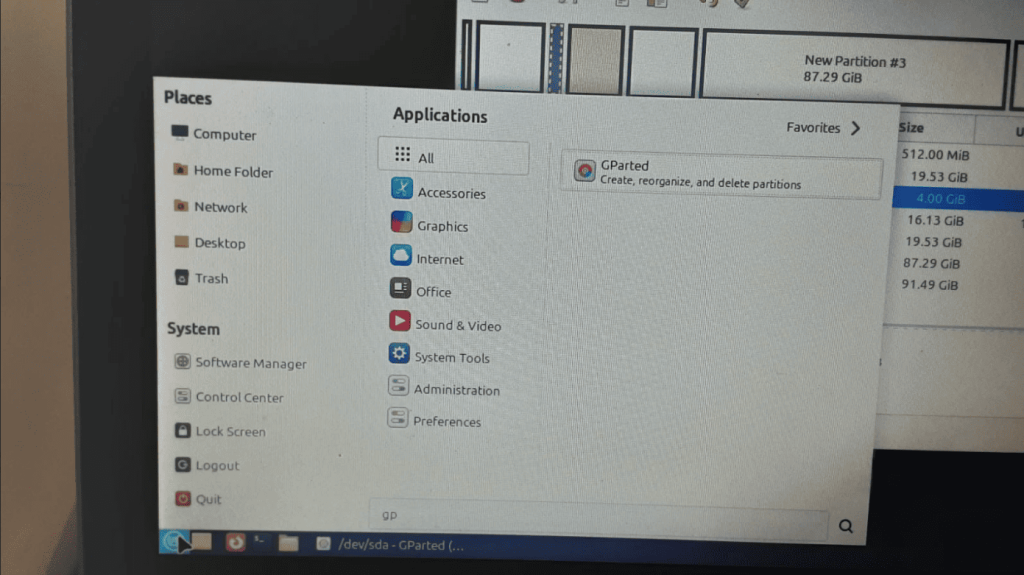 Una vegada que hem iniciat la ‘Live Session’ de Linux Mint, el següent pas és accedir a l’eina que ens permetrà redimensionar i crear les noves particions: GParted.