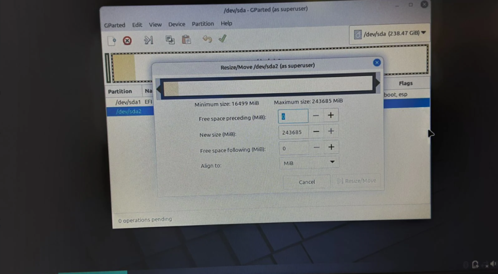 Per fer-ho, vaig fer clic dret sobre la partició /dev/sda2 i vaig seleccionar l’opció Resize/Move (Redimensionar/Moure).