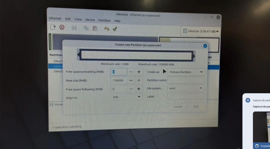 Després de redimensionar la partició principal, veiem l’espai restant com a ‘unallocated‘ (no assignat) a la interfície de GParted. Vaig fer clic dret sobre aquest espai no assignat i vaig seleccionar New (Nou) per començar a crear les particions que exigeix la tasca (PRO+).