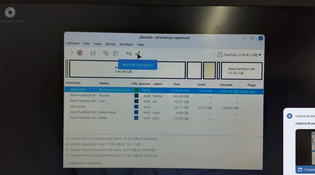 Una vegada que vaig confirmar que tota l’estructura era correcta, vaig fer clic al botó Apply All Operations (Aplicar totes les operacions) perquè GParted realitzés tots els canvis físics al disc dur. Aquest procés triga uns minuts i l’equip no s’ha d’apagar.