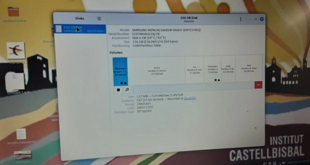 Per a la comprovació final, vaig obrir l’aplicació Disks (Discos) de Linux. Aquesta captura demostra que la solució va ser un èxit total. Ara el meu disc de 256 GB ja no té una única partició, sinó que està organitzat de forma òptima: