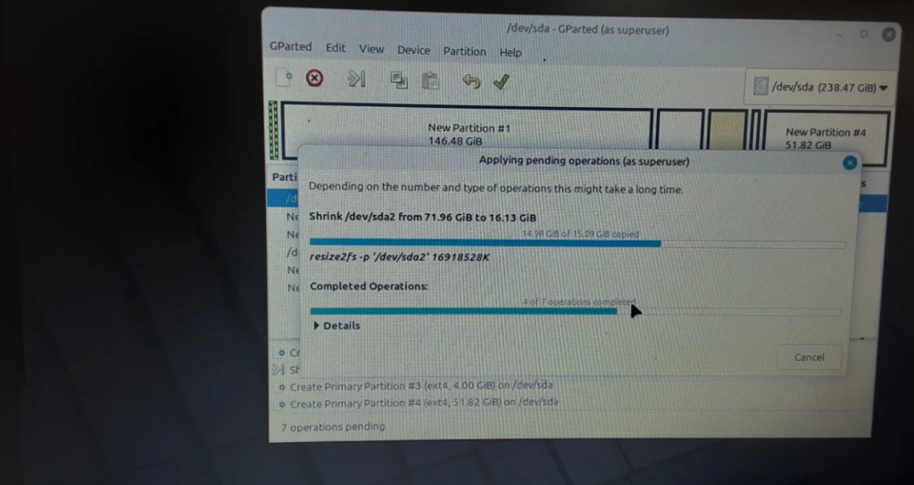 Com es pot veure, l’operació més crítica i la que més temps requereix és la de redimensionar la partició original (/dev/sda2), ja que ha de moure i reajustar les dades existents, com s’indica a la línia: Shrink /dev/sda2 from 71.96 GiB to 16.13 GiB.